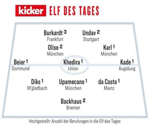 中場:拜爾(多特)、拉尼-赫迪拉(柏林聯(lián)合)、安東-卡德(奧格斯堡)、奧利塞(拜仁)、倫納特-卡爾(拜仁)