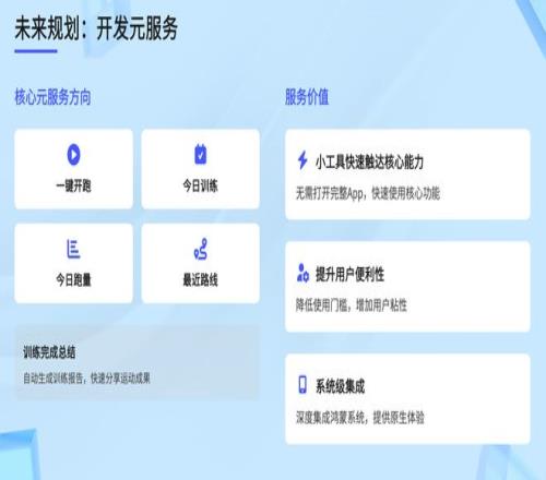 聚焦核心高頻功能,打造“無(wú)需打開(kāi)完整APP即可快速使用”的元服務(wù),包括一鍵開(kāi)跑、今日訓(xùn)練、今日跑量、最近路線、訓(xùn)練完成總結(jié)等方向,核心價(jià)值在于: