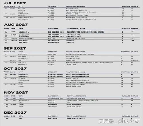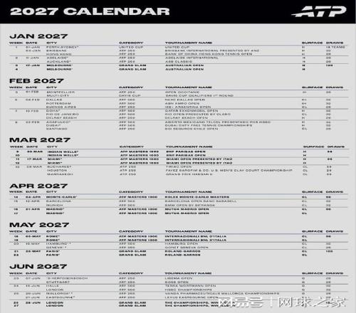 我們?cè)賮黻P(guān)注其它消息。北京時(shí)間今晨,ATP公布了2027賽季巡回賽的賽歷。2027賽季,ATP巡回賽將覆蓋全球29個(gè)國家和地區(qū),共舉辦59項(xiàng)賽事,另加四項(xiàng)大滿貫賽事,其中有7站大師賽將采用升級(jí)后的12天賽制。具體請(qǐng)看附圖。